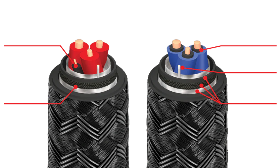- Es gibt kein Metall in den Kabelummantelungen oder Steckerhülsen, das RF-Rauschen in das Kabel zurückstrahlen und kapazitiv koppeln würde. Kaltgeschweisste, gasdichte Verbindungen werden zu roten Kupferklemmen oder Bananen hergestellt.