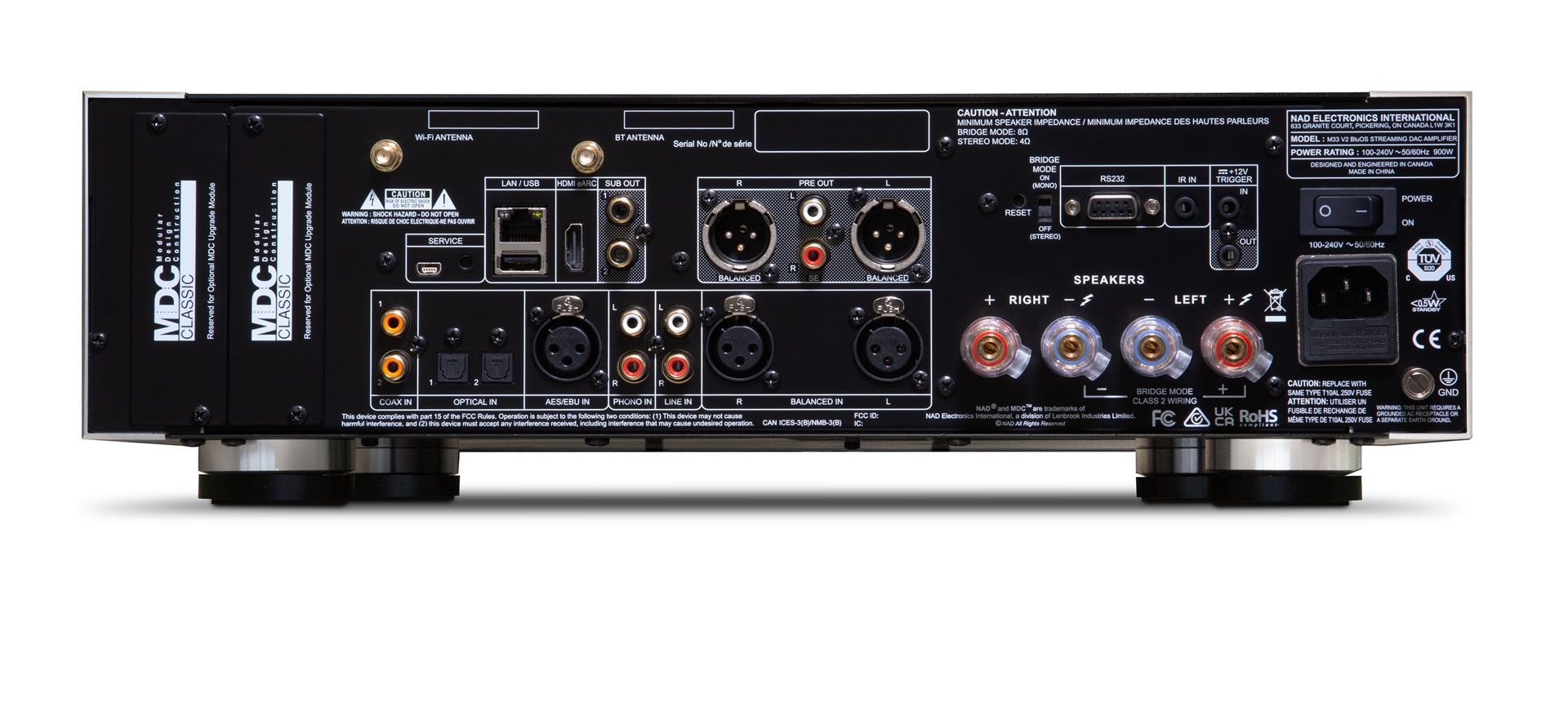 In der Standardkonfiguration ist der NAD M33 V2 BluOS Streaming-Verstärker ein komplettes System – einfach Lautsprecher hinzufügen. HDMI eARC, digitale und analoge Eingänge, ein hochwertiger MM/MC-Phono-Vorverstärker sowie symmetrische XLR-Stereo-Verstärkereingänge und Vorverstärkerausgänge bieten alles, was Sie heute und morgen brauchen. Für zukünftige Erweiterungen ermöglichen zwei MDC-Steckplätze die Integration neuer Module wie des MDC USB DSD, das DSD-Wiedergabe und USB-Audio-Unterstützung ermöglicht. Zwei unabhängige Subwoofer-Ausgänge bieten jetzt eine höhere Leistung als der ursprüngliche M33 und ermöglichen so die einfache Erweiterung zu Dirac-optimierten Multi-Subwoofer-Systemen – ideal für Heimkino-Enthusiasten oder alle, die eine 2-Kanal-Endstufenleistung der Spitzenklasse mit integriertem Streaming suchen.