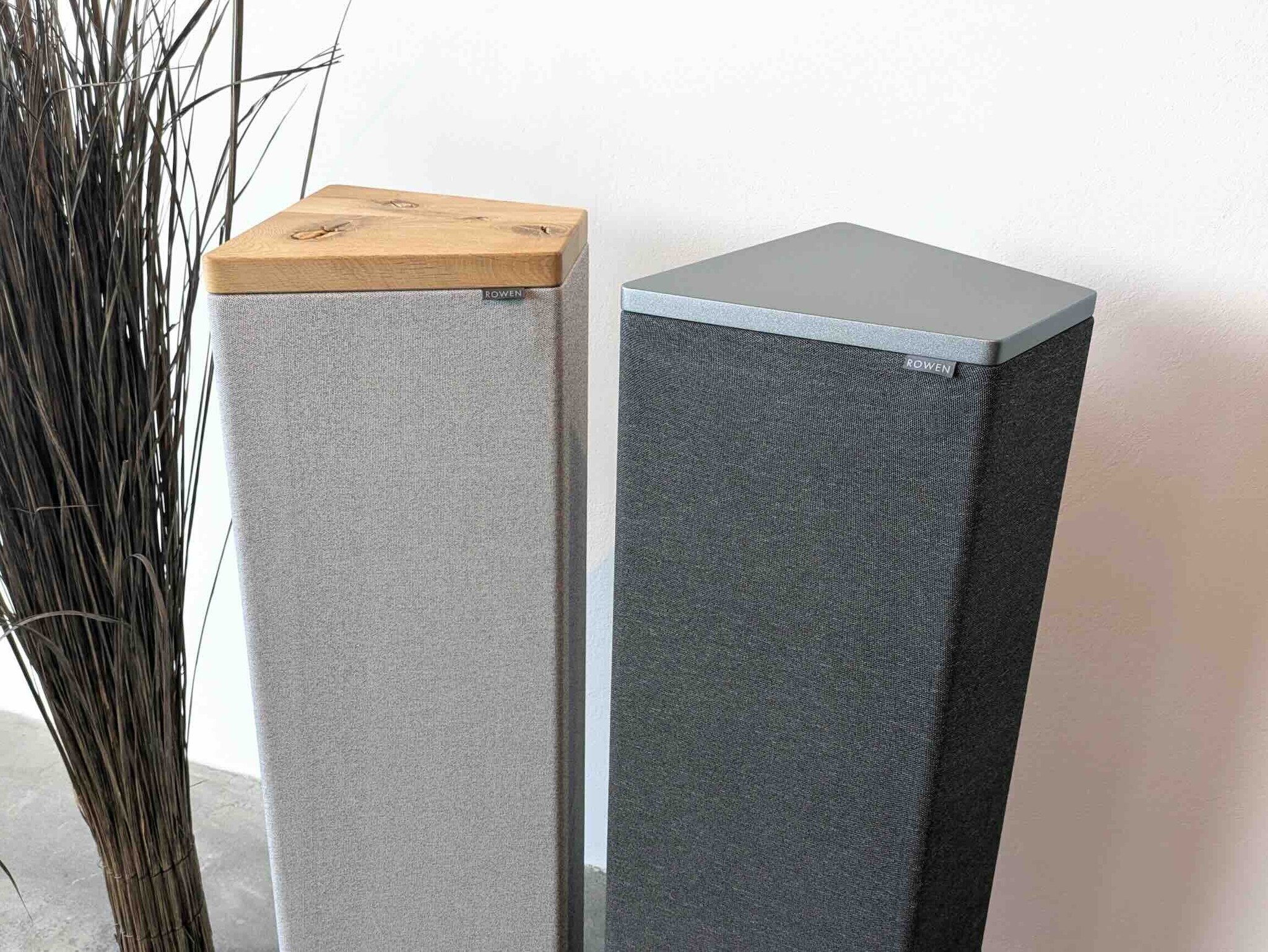 Rowen frischt mit neuen Abdeckplatten in Titan-Optik und mit seiner neuen Urban-Stoff-Linie die Symphony-Modelle auf: Die neuen Stoffbezüge aus verwobenen Fäden (Urban Light, Urban Dark) und das trendige Stoff-Etikett mit aufgesticktem Markenlogo verleihen den eleganten Klangsäulen einen modern urbanen Touch.