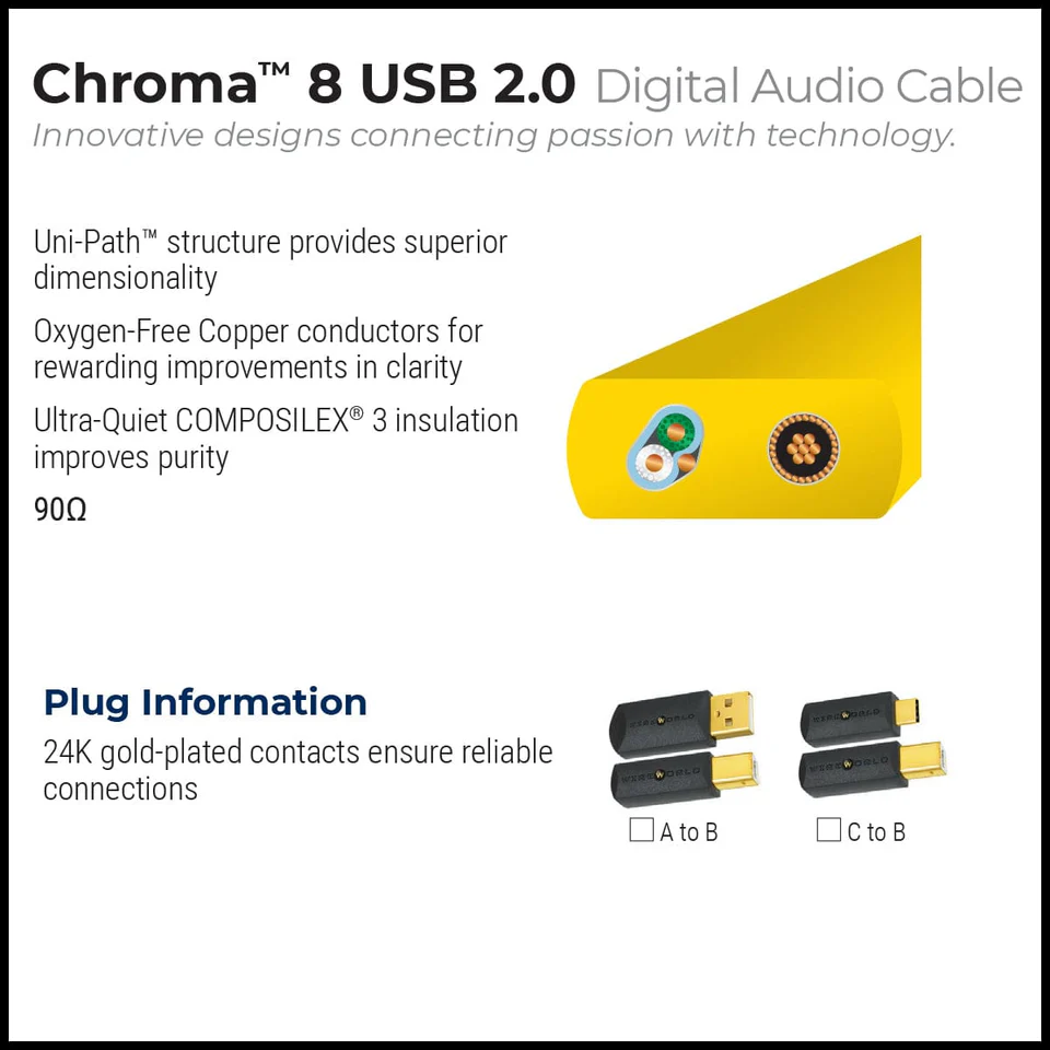 Chroma 8 USB 2.0-Audiokabel bieten die hervorragende Klangqualität des Uni-Path-Designs zu einem Preis, der nur geringfügig über dem von Standardkabeln liegt. Wie bei allen Wireworld USB-Kabeln verbessert der geräuschabsorbierende Stromleiter die Klangreinheit. Dieses 28-Gauge-Kabel übertrifft die offiziellen USB-Highspeed-Spezifikationen.